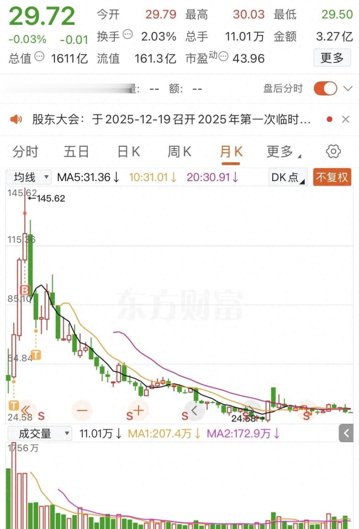145元的价位杀进去,一买就是万股,如今股价只剩下29.72元,月线走势那叫一个惨烈,60度角的俯冲让人心惊胆战。亏了多少?-79.50%的收益率,账面损失超过115万,这个数字让人看了都心凉。